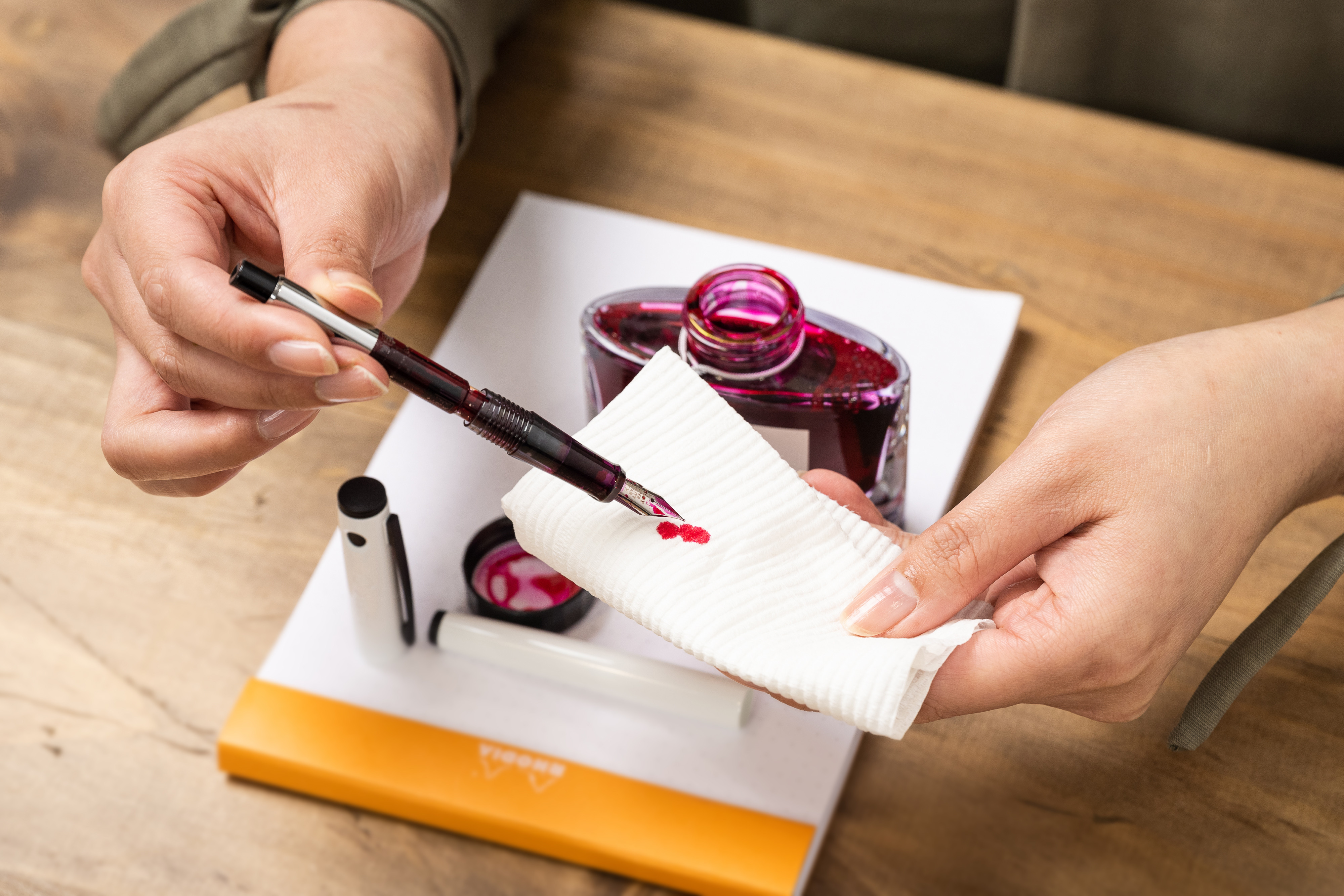 To clean your pen, flush out old ink, soak the nib, and dry it with a soft cloth. We also have a detailed guide on cleaning your fountain pen if you’re interested.