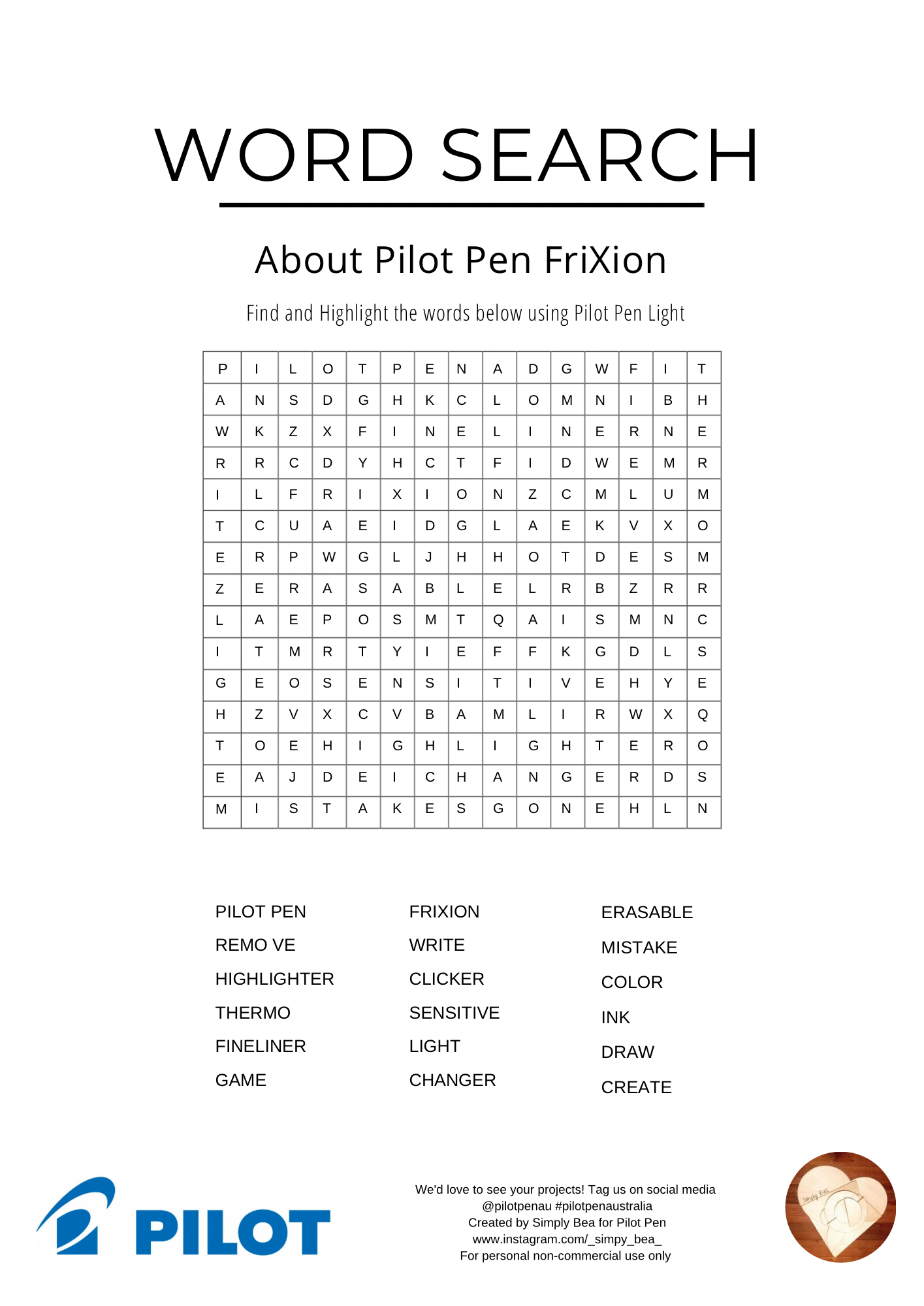Print the template on a quality sheet of paper. Choose your favourite Frixion Light highlighter colour and find and highlight the words using PILOT Pen FriXion Light. Gently highlight each word as you find it in the puzzle. Notice how smoothly the ink glides onto the paper and how vibrant the colours are.