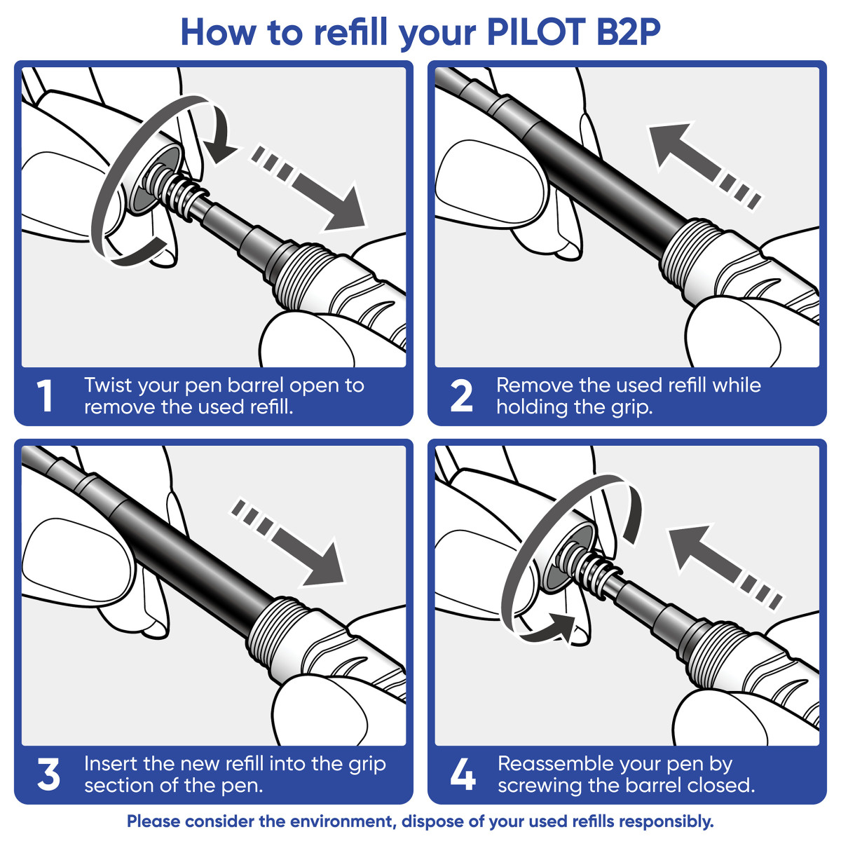 The B2P Gel pen is refillable and uses PILOT BLS-G2 refills, which makes it an environmentally friendly choice that can help reduce waste.