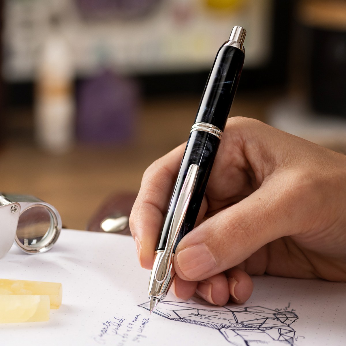 With PILOT’s impeccably designed mechanism, the nib effortlessly retracts into the barrel, showcasing a fusion of cutting-edge technology and sophistication. The in-house manufactured 18K gold nib is enhanced with rhodium plating, complimented by sleek silver trim accents, and encased within a captivating marble resin barrel.